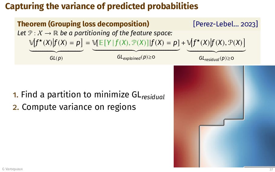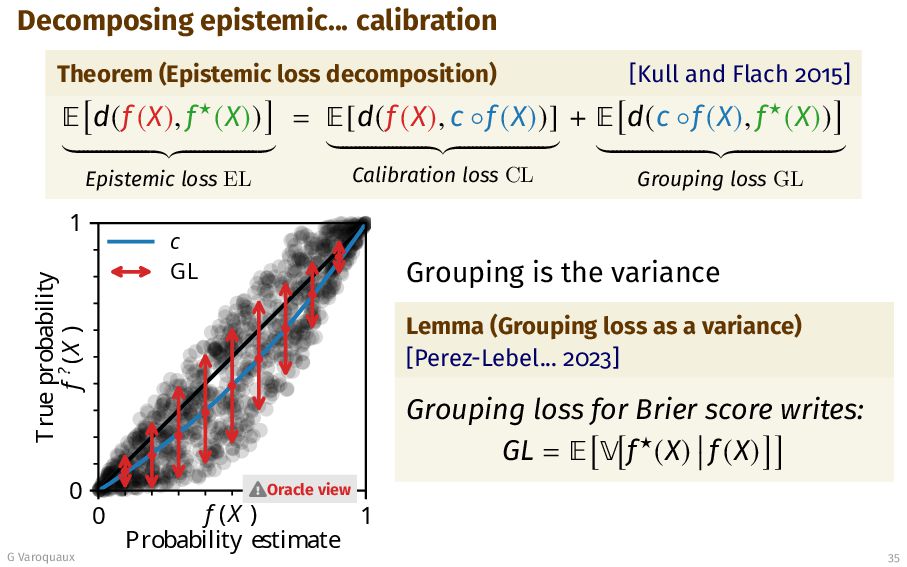 2015] ¾ d(f (X), f⋆(X)) Epistemic loss EL = ¾[d(f (X), c ◦f (X))] Calibration loss CL + ¾ d(c ◦f (X), f⋆(X)) Grouping loss GL 0 1 f (X ) Probability estimate 0 1 True probability f ? (X ) c GL Oracle view Grouping is the variance Lemma (Grouping loss as a variance) [Perez-Lebel... 2023] Grouping loss for Brier score writes: GL = ¾ f⋆(X) f (X) G Varoquaux 35