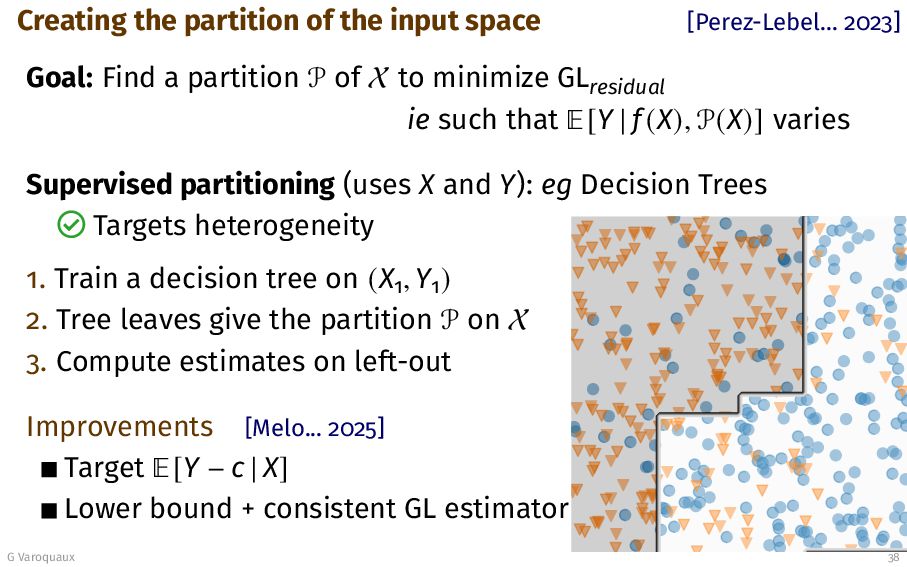 Find a partition P of X to minimize GLresidual ie such that ¾[Y | f (X), P(X)] varies Supervised partitioning (uses X and Y): eg Decision Trees Targets heterogeneity 1. Train a decision tree on (X1, Y1) 2. Tree leaves give the partition P on X 3. Compute estimates on left-out Improvements [Melo... 2025] Target ¾[Y − c | X] Lower bound + consistent GL estimator G Varoquaux 38