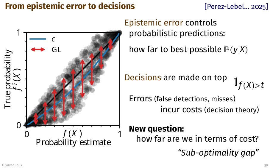 (X ) Probability estimate 0 1 True probability f ? (X ) c GL Epistemic error controls probabilistic predictions: how far to best possible (y|X) Decisions are made on top 1f (X)>t Errors (false detections, misses) incur costs (decision theory) New question: how far are we in terms of cost? “Sub-optimality gap” G Varoquaux 39