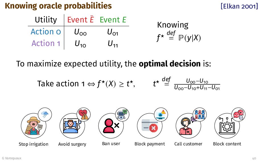 E Action 0 U00 U01 Action 1 U10 U11 Knowing f⋆ def = (y|X) To maximize expected utility, the optimal decision is: Take action 1 ⇔ f⋆(X) ≥ t⋆, t⋆ def = U00−U10 U00−U10+U11−U01 Stop irrigation Avoid surgery Ban user Block payment Call customer Block content G Varoquaux 40