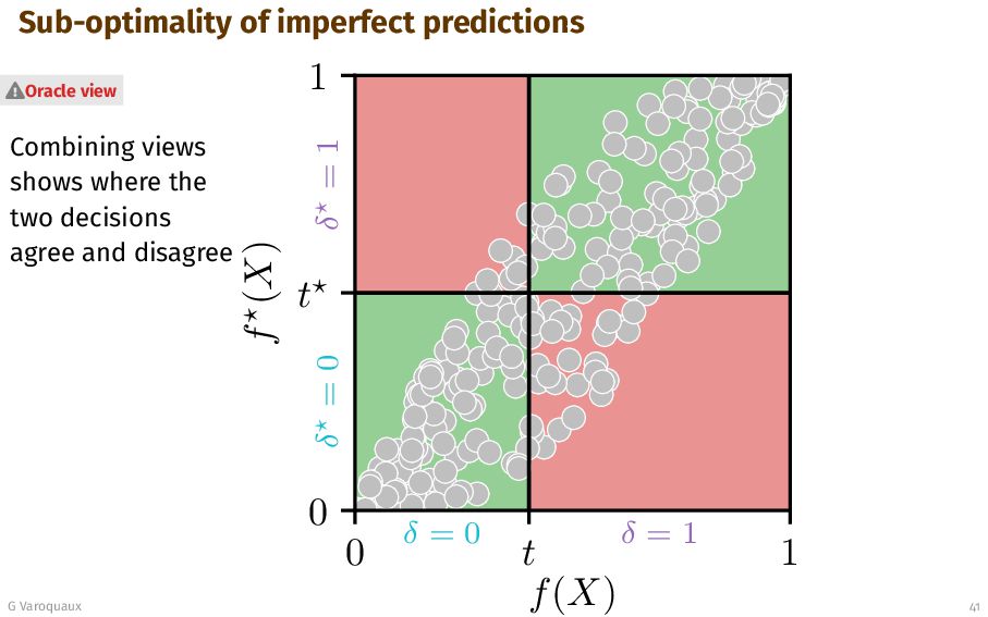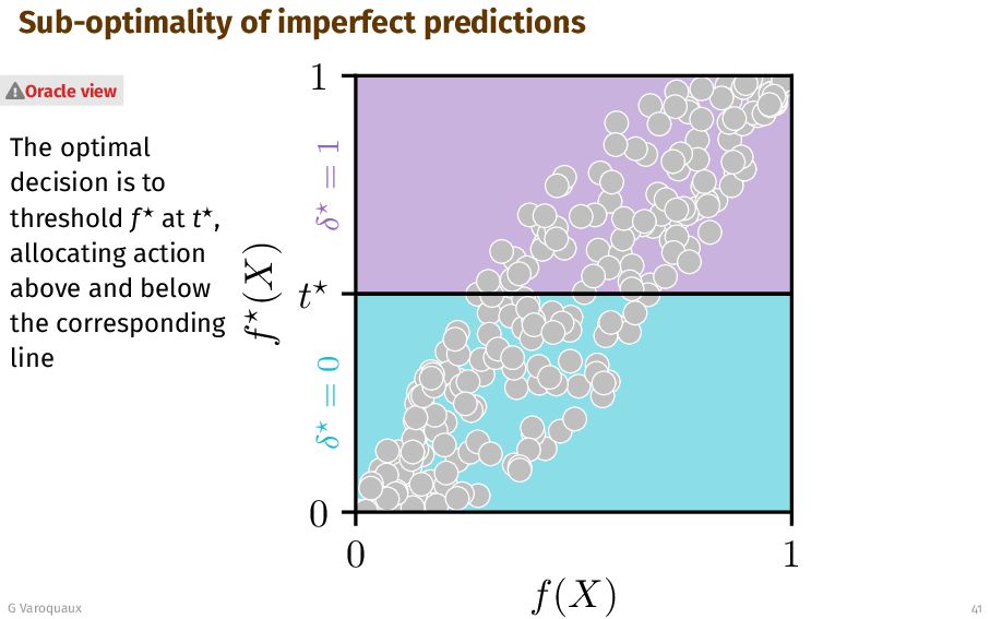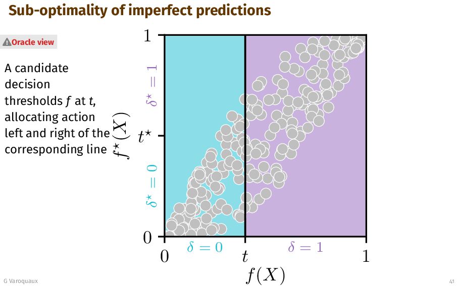 t 1 f (X) δ = 0 δ = 1 δ = 0 δ = 1 Oracle view G Varoquaux 41 A candidate decision thresholds f at t, allocating action left and right of the corresponding line