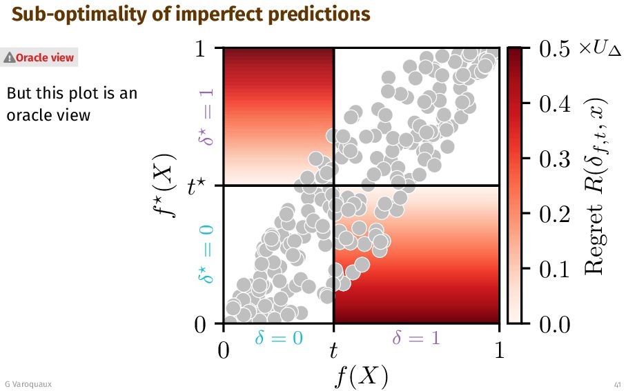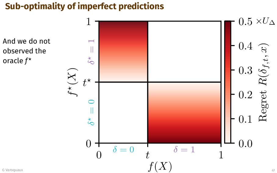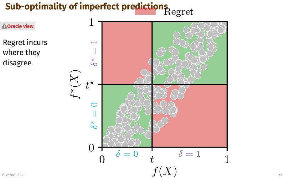 t 1 f (X) δ = 0 δ = 1 δ = 0 δ = 1 0.0 0.1 0.2 0.3 0.4 0.5 Regret R(δf,t , x) ×U∆ Oracle view G Varoquaux 41 The further away the true probability f⋆ is from t⋆, the more regret