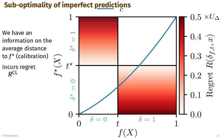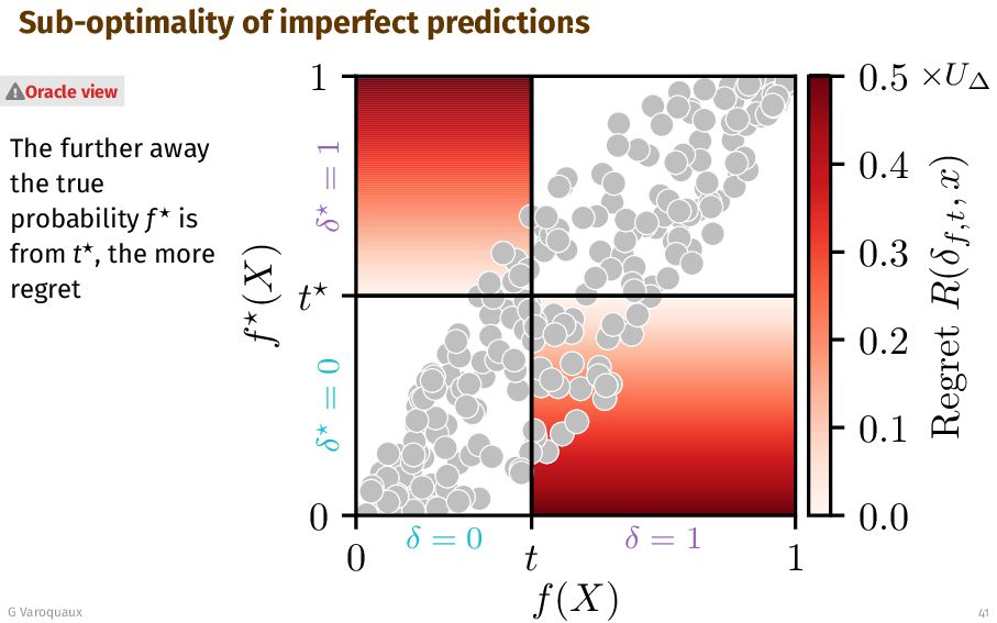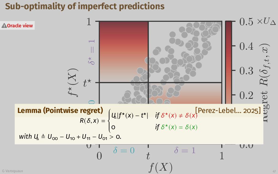 t 1 f (X) δ = 0 δ = 1 δ = 0 δ = 1 0.0 0.1 0.2 0.3 0.4 0.5 Regret R(δf,t , x) ×U∆ Lemma (Pointwise regret) [Perez-Lebel... 2025] R(δ, x) =        U ∆ |f⋆(x) − t⋆| if δ⋆(x) δ(x) 0 if δ⋆(x) = δ(x) with U ∆ ≜ U00 − U10 + U11 − U01 > 0. Oracle view G Varoquaux 41