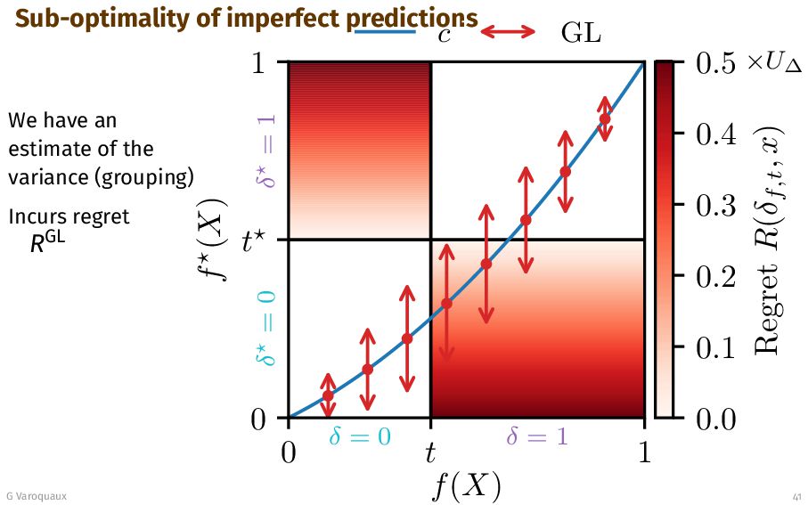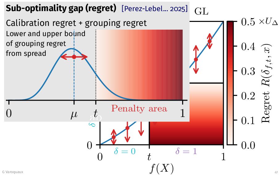 t 1 f (X) δ = 0 δ = 1 δ = 0 δ = 1 c GL 0.0 0.1 0.2 0.3 0.4 0.5 Regret R(δf,t , x) ×U∆ G Varoquaux 41 Sub-optimality gap (regret) [Perez-Lebel... 2025] Calibration regret + grouping regret Lower and upper bound of grouping regret from spread ap 0 µ t 1 Penalty area pZ Mean Var