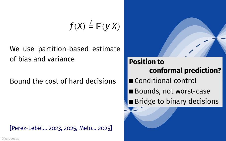 bias and variance Bound the cost of hard decisions [Perez-Lebel... 2023, 2025, Melo... 2025] G Varoquaux 43 Position to conformal prediction? Conditional control Bounds, not worst-case Bridge to binary decisions