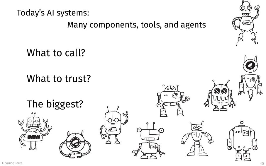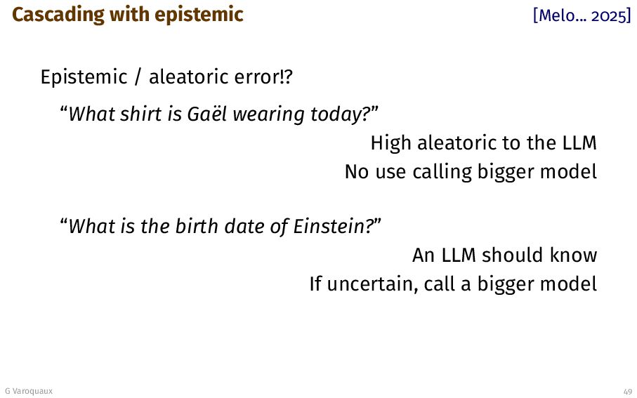 shirt is Ga¨ el wearing today?” High aleatoric to the LLM No use calling bigger model “What is the birth date of Einstein?” An LLM should know If uncertain, call a bigger model G Varoquaux 49