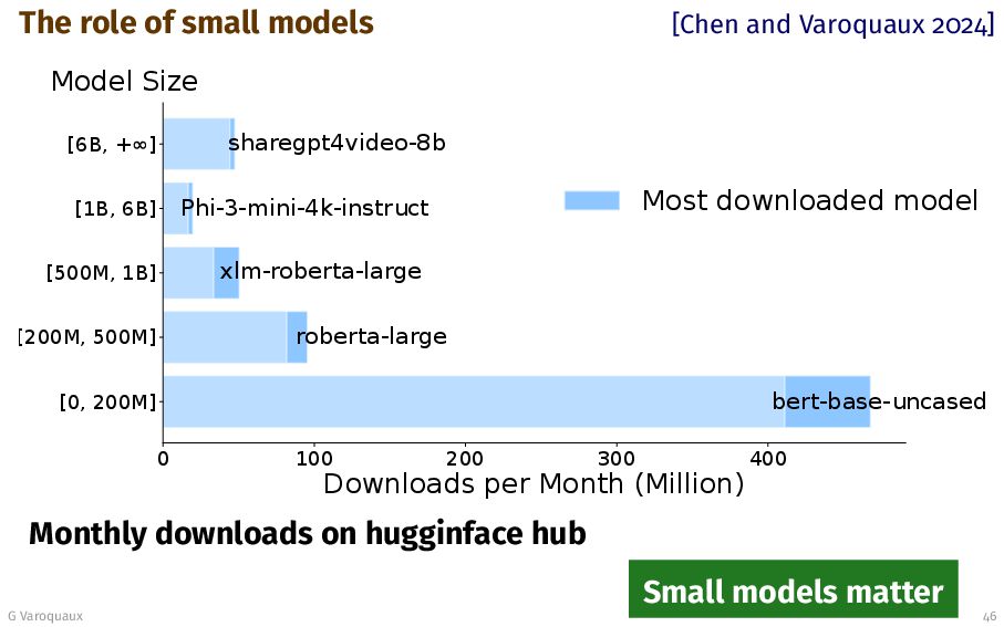 100 200 300 400 Downloads per Month (Million) [0, 200M] [200M, 500M] [500M, 1B] [1B, 6B] [6B, + ] Model Size bert-base-uncased roberta-large xlm-roberta-large Phi-3-mini-4k-instruct sharegpt4video-8b Most downloaded model Monthly downloads on hugginface hub Small models matter G Varoquaux 46
