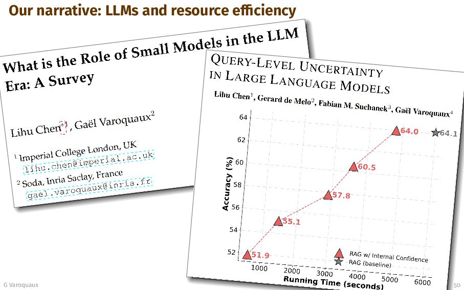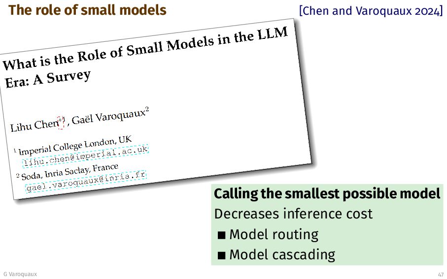 Use model 2. See if answers are good enough - If so return answer 3. If no, pick next model (in order of cost) 4. Go to 1. G Varoquaux 48 [Kag and Fedorov 2023, Chen... 2023, Hu... 2024 Review in [Chen and Varoquaux 2024