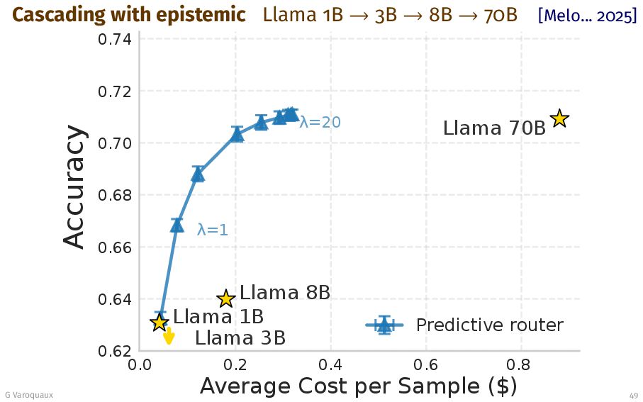 70B [Melo... 2025] 0.0 0.2 0.4 0.6 0.8 Average Cost per Sample ($) 0.62 0.64 0.66 0.68 0.70 0.72 0.74 Accuracy =1 =20 Llama 1B Llama 3B Llama 8B Llama 70B Predictive router G Varoquaux 49