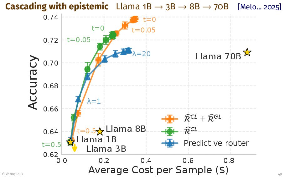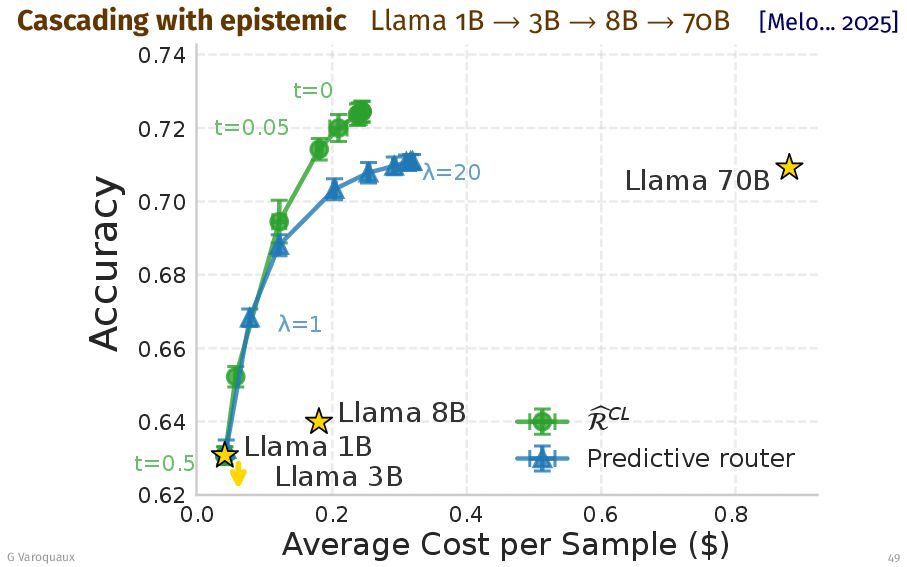 70B [Melo... 2025] 0.0 0.2 0.4 0.6 0.8 Average Cost per Sample ($) 0.62 0.64 0.66 0.68 0.70 0.72 0.74 Accuracy t=0 t=0.05 t=0.5 =1 =20 Llama 1B Llama 3B Llama 8B Llama 70B CL Predictive router G Varoquaux 49