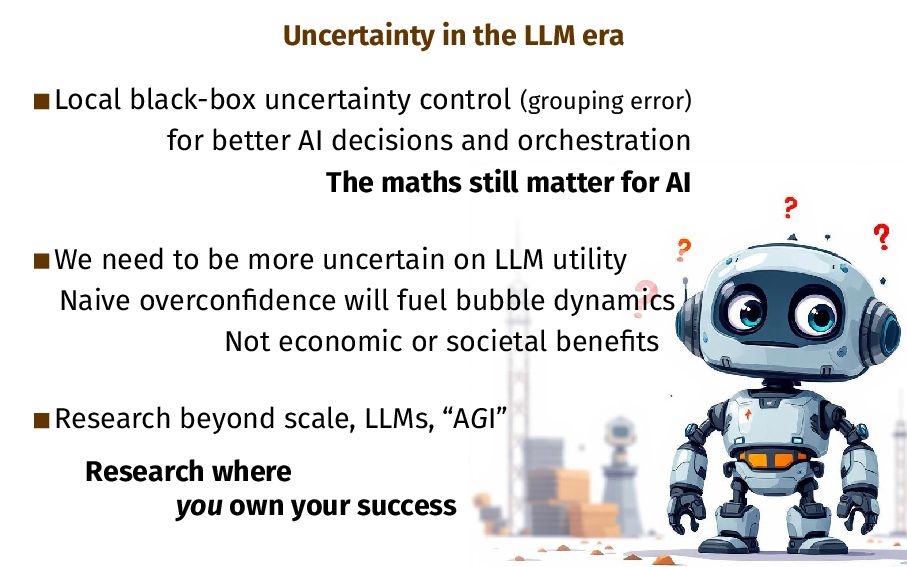 error) for better AI decisions and orchestration The maths still matter for AI We need to be more uncertain on LLM utility Naive overconfidence will fuel bubble dynamics Not economic or societal benefits Research beyond scale, LLMs, “AGI” Research where you own your success