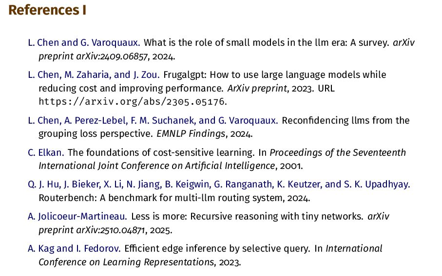 role of small models in the llm era: A survey. arXiv preprint arXiv:2409.06857, 2024. L. Chen, M. Zaharia, and J. Zou. Frugalgpt: How to use large language models while reducing cost and improving performance. ArXiv preprint, 2023. URL https://arxiv.org/abs/2305.05176. L. Chen, A. Perez-Lebel, F. M. Suchanek, and G. Varoquaux. Reconfidencing llms from the grouping loss perspective. EMNLP Findings, 2024. C. Elkan. The foundations of cost-sensitive learning. In Proceedings of the Seventeenth International Joint Conference on Artificial Intelligence, 2001. Q. J. Hu, J. Bieker, X. Li, N. Jiang, B. Keigwin, G. Ranganath, K. Keutzer, and S. K. Upadhyay. Routerbench: A benchmark for multi-llm routing system, 2024. A. Jolicoeur-Martineau. Less is more: Recursive reasoning with tiny networks. arXiv preprint arXiv:2510.04871, 2025. A. Kag and I. Fedorov. Efficient edge inference by selective query. In International Conference on Learning Representations, 2023.
