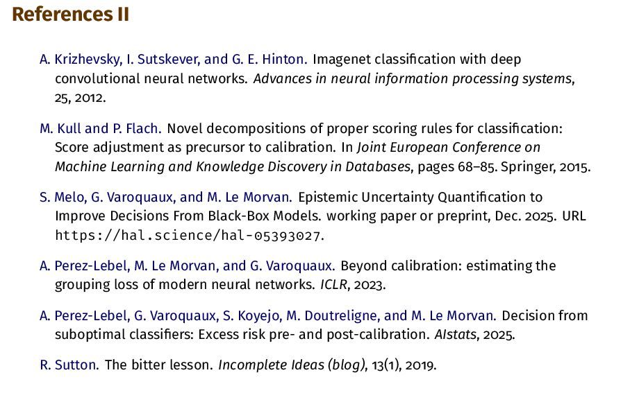 Imagenet classification with deep convolutional neural networks. Advances in neural information processing systems, 25, 2012. M. Kull and P. Flach. Novel decompositions of proper scoring rules for classification: Score adjustment as precursor to calibration. In Joint European Conference on Machine Learning and Knowledge Discovery in Databases, pages 68–85. Springer, 2015. S. Melo, G. Varoquaux, and M. Le Morvan. Epistemic Uncertainty Quantification to Improve Decisions From Black-Box Models. working paper or preprint, Dec. 2025. URL https://hal.science/hal-05393027. A. Perez-Lebel, M. Le Morvan, and G. Varoquaux. Beyond calibration: estimating the grouping loss of modern neural networks. ICLR, 2023. A. Perez-Lebel, G. Varoquaux, S. Koyejo, M. Doutreligne, and M. Le Morvan. Decision from suboptimal classifiers: Excess risk pre- and post-calibration. AIstats, 2025. R. Sutton. The bitter lesson. Incomplete Ideas (blog), 13(1), 2019.