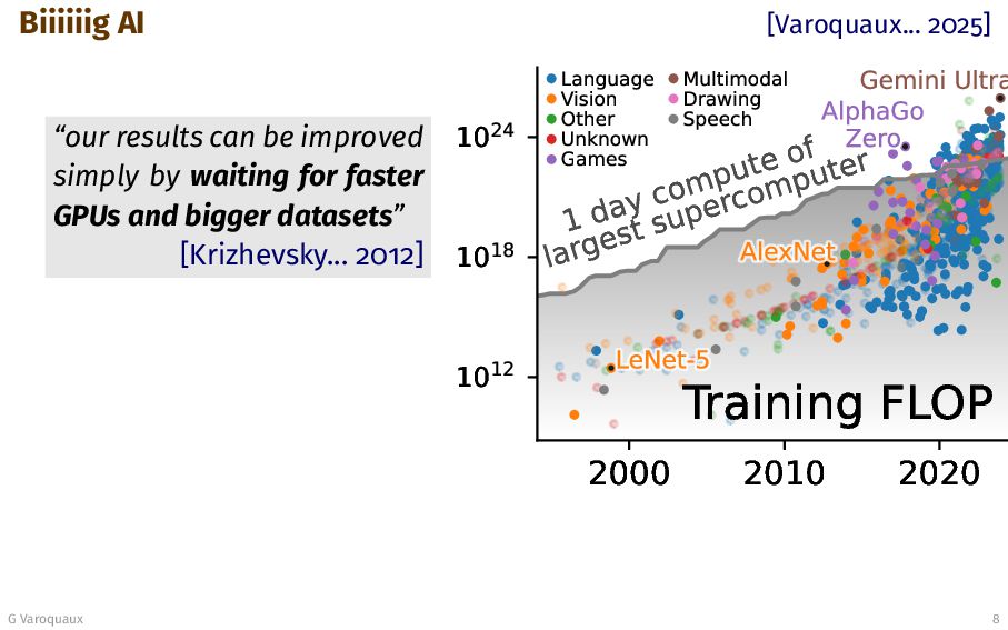 AI “leveraging computation is ul- timately the most effective” [Sutton 2019] G Varoquaux 7 “our results can be improved simply by waiting for faster GPUs and bigger datasets” [Krizhevsky... 2012]