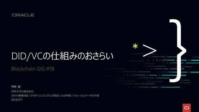 • 規格として証明書の形式および発行、保持、提示、検証などの 運用方法が規定されている • 以下のような項目を持つ • 誰が発行したのか(issuer) • 誰/何についてのどのような情報か(subject) • 誰/何:HolderのDID • どのような:資格情報の内容 • 発行者のデジタル署名 • 署名検証用の公開鍵の所在 14 Copyright © 2024, Oracle and/or its affiliates { "@context": [ "https://www.w3.org/2018/credentials/v1", "https://www.w3.org/2018/credentials/examples/v1", "https://w3id.org/security/suites/ed25519-2020/v1" ], "id": "http://example.edu/credentials/3732", "type": [ "VerifiableCredential", "UniversityDegreeCredential" ], "issuer": { "id": "did:example:76e12ec712ebc6f1c221ebfeb1f", "name": "Example University" }, "issuanceDate": "2010-01-01T19:23:24Z", "credentialSubject": { "id": "did:example:ebfeb1f712ebc6f1c276e12ec21", "degree": { "type": "BachelorDegree", "name": "Bachelor of Science and Arts" } }, "proof": { "type": "Ed25519Signature2020", "created": "2022-02-25T14:58:43Z", "verificationMethod": "did:example:76e12ec712ebc6f1c221ebfeb1f#key-1", "proofPurpose": "assertionMethod", "proofValue": "z2Xdmp6YDYz5RPKeRFDcPYorAmnERyr7aRNzv176oLMxwcW7GgKxAQT 45jUKwsMA1XvrmFT5Y8WCx7ZnkNTTHJnu9" } } Verifiable Credentialの例