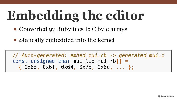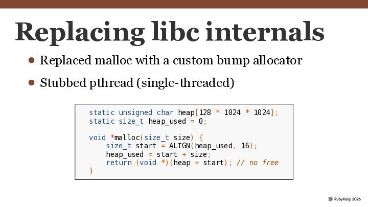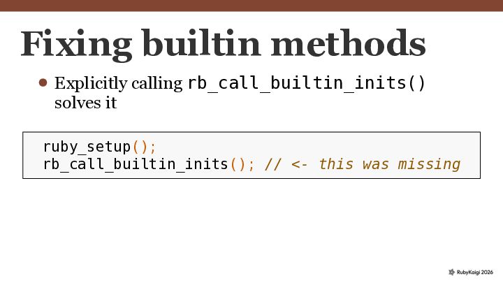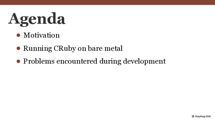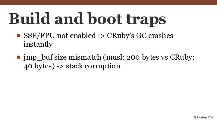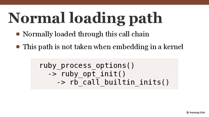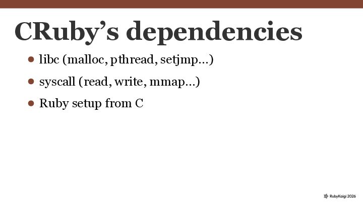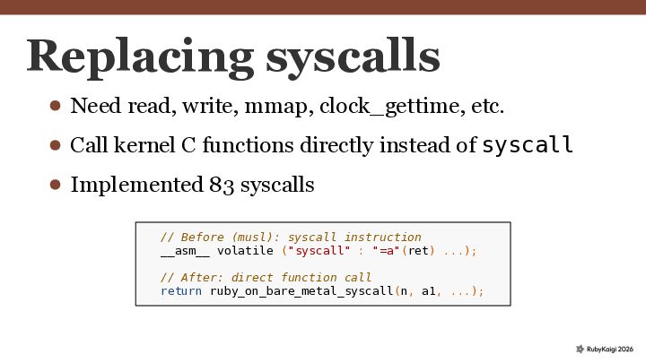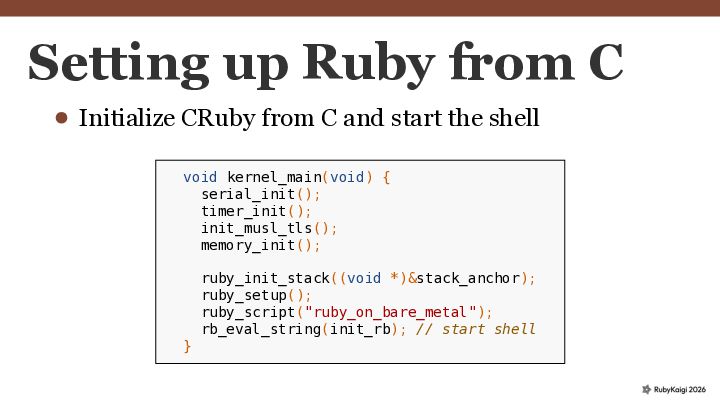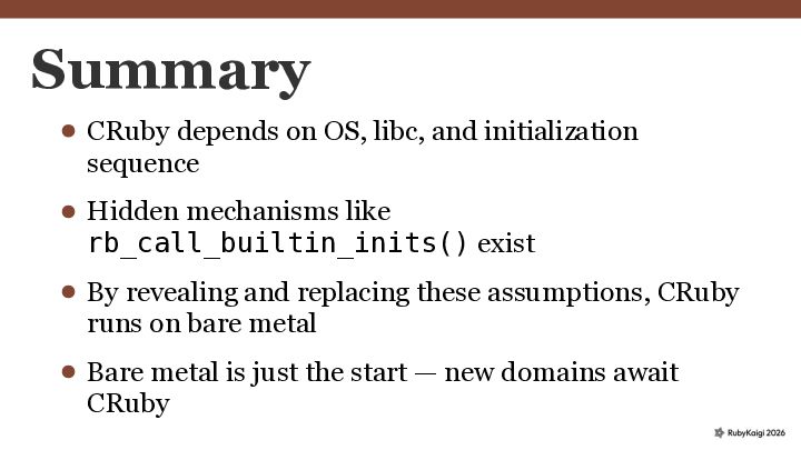 mechanisms like rb_call_builtin_inits() exist By revealing and replacing these assumptions, CRuby runs on bare metal Bare metal is just the start — new domains await CRuby