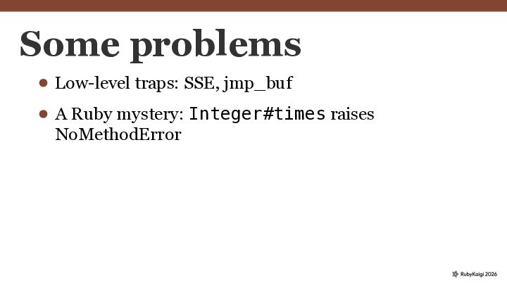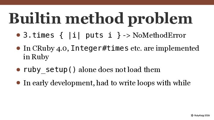 NoMethodError In CRuby 4.0, Integer#times etc. are implemented in Ruby ruby_setup() alone does not load them In early development, had to write loops with while