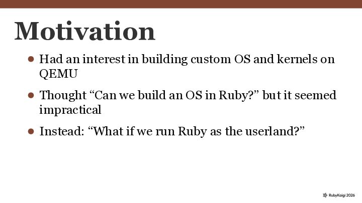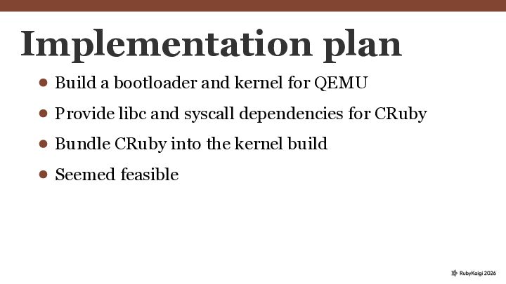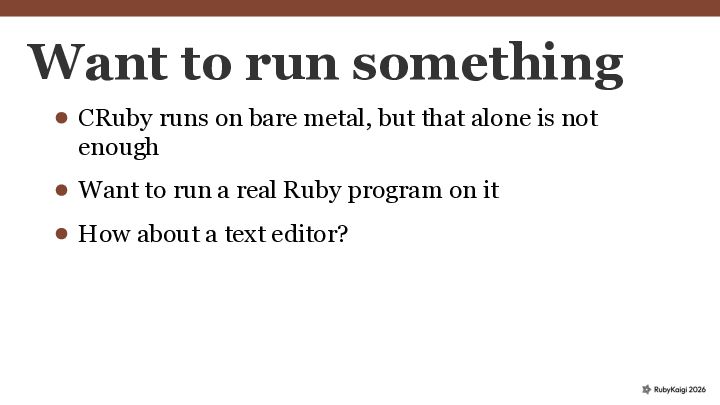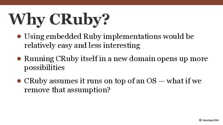 and less interesting Running CRuby itself in a new domain opens up more possibilities CRuby assumes it runs on top of an OS — what if we remove that assumption?