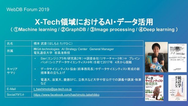 ④Deep learning ) WebDB Forum 2019 氏名 橋本 武彦(はしもと たけひこ) 所属 ㈱GA technologies AI Strategy Center General Manager 電気通信大学 客員准教授 キャリア サマリ • Sier(エンジニア5年/研究員2年)⇒調査会社(リサーチャー3年)⇒ ブレイン パッド(シニアデータサイエンティスト9年)を経て2017年 4月から現職 • データサイエンティスト協会(前事務局長)やデータサイエンティスト育成の新 規事業の立ち上げ • 電通大、滋賀大、慶應SFC、立教大など大学や官公庁での講義や講演・執筆 など E-Mail