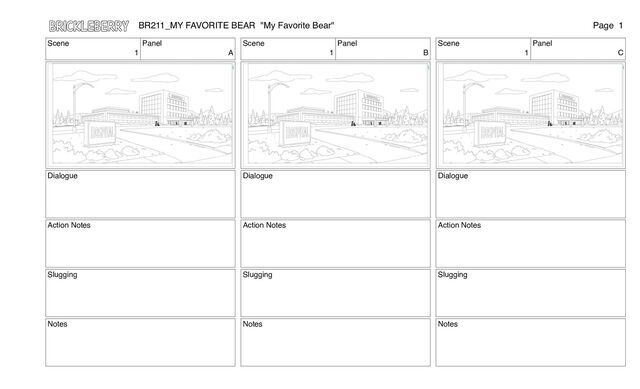 1 Panel B Dialogue Action Notes Slugging Notes Scene 1 Panel C Dialogue Action Notes Slugging Notes BR211_MY FAVORITE BEAR "My Favorite Bear" Page 1