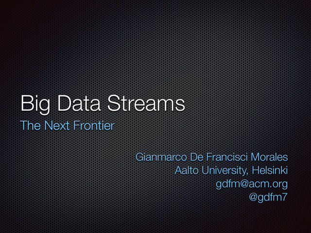 The rate at which the world produces data is growing steadily, thus creating ever larger streams of continuously evolving data. However, current (de-facto standard) solutions for big data analysis are not designed to mine evolving streams. Big data streams are just starting to be studied systematically, they are the next frontier for data analytics. As such, best practices in this context are still not ironed out, and the landscape is rapidly changing: it’s a wild west.