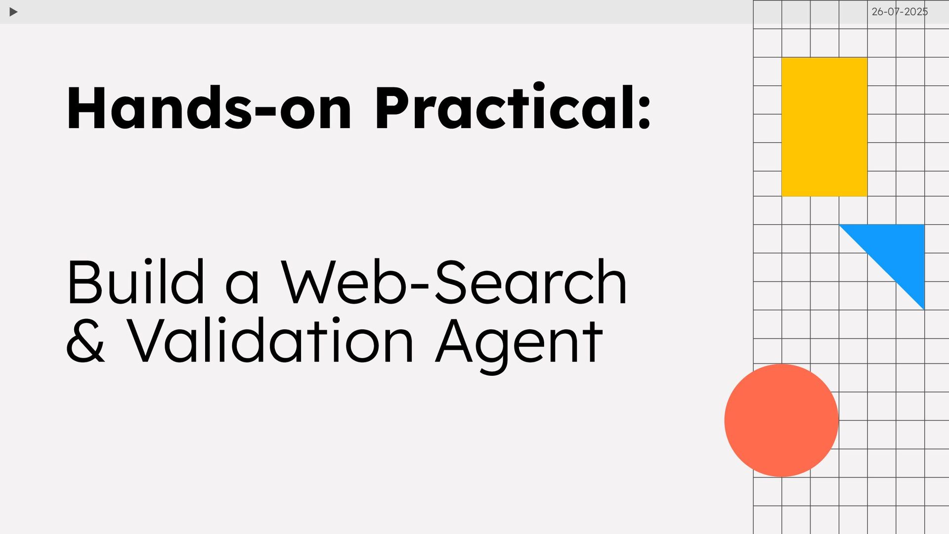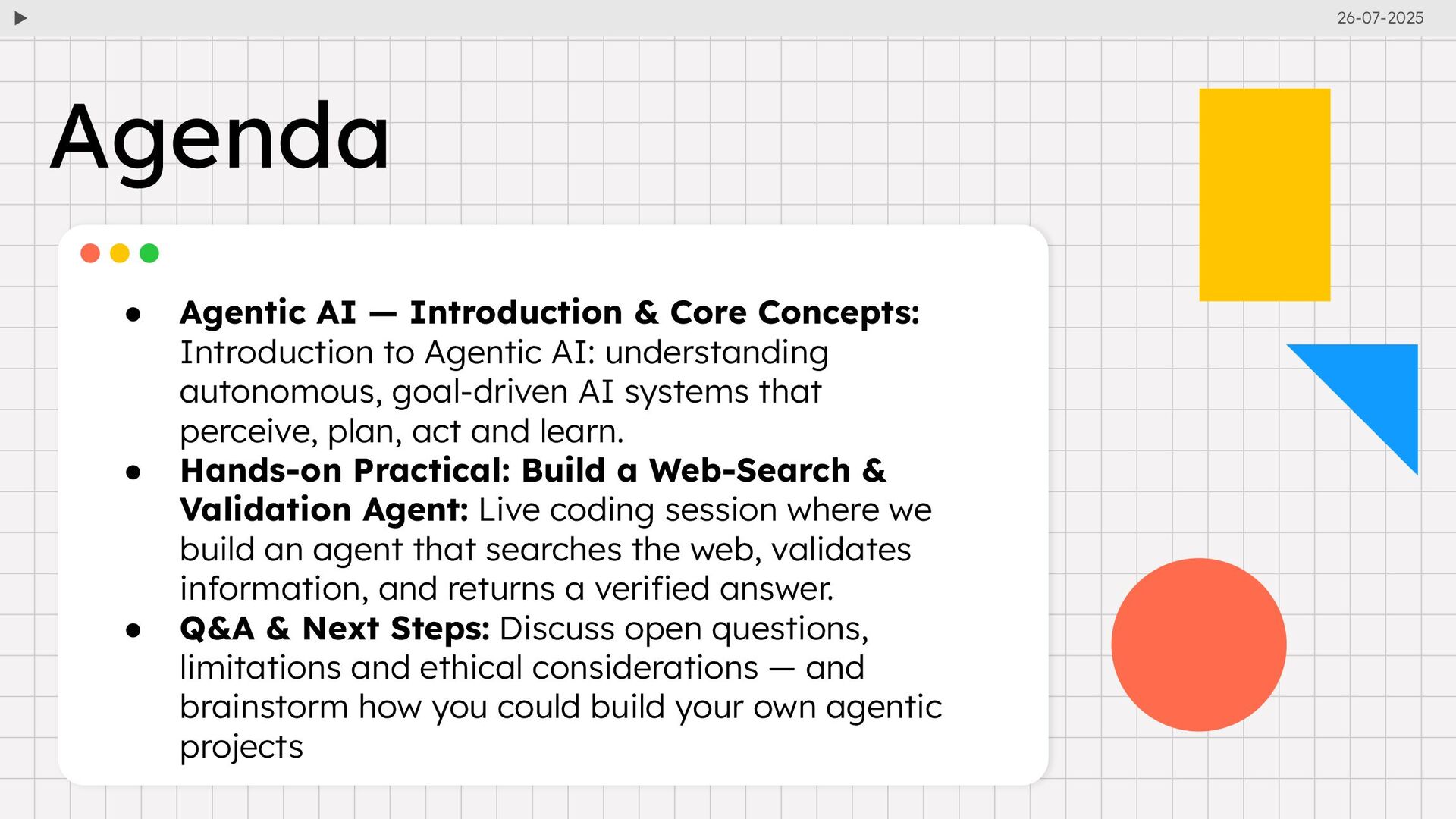 Agentic AI: understanding autonomous, goal-driven AI systems that perceive, plan, act and learn. • Hands-on Practical: Build a Web-Search & Validation Agent: Live coding session where we build an agent that searches the web, validates information, and returns a verified answer. • Q&A & Next Steps: Discuss open questions, limitations and ethical considerations — and brainstorm how you could build your own agentic projects Agenda 26-07-2025