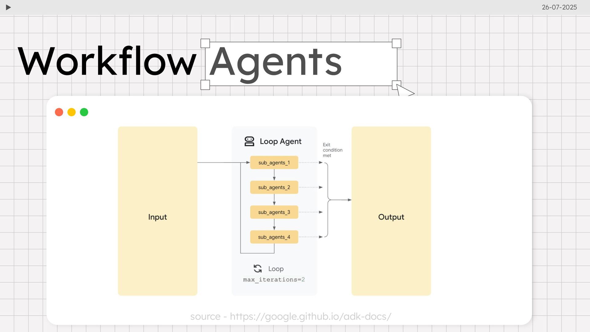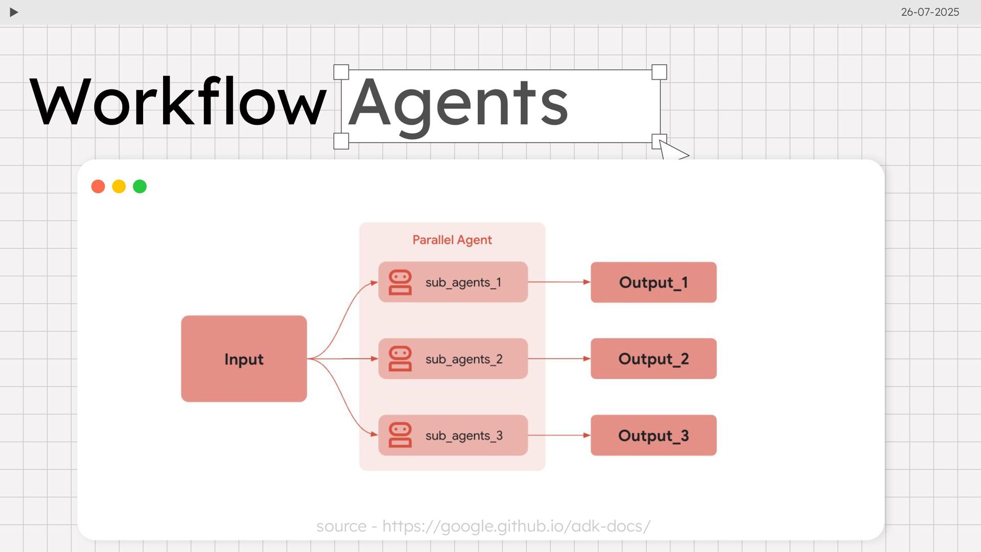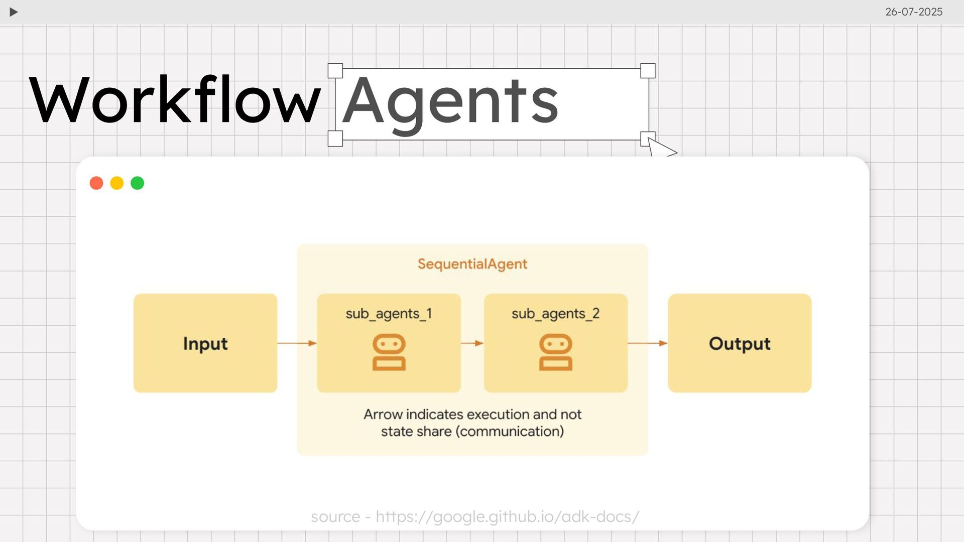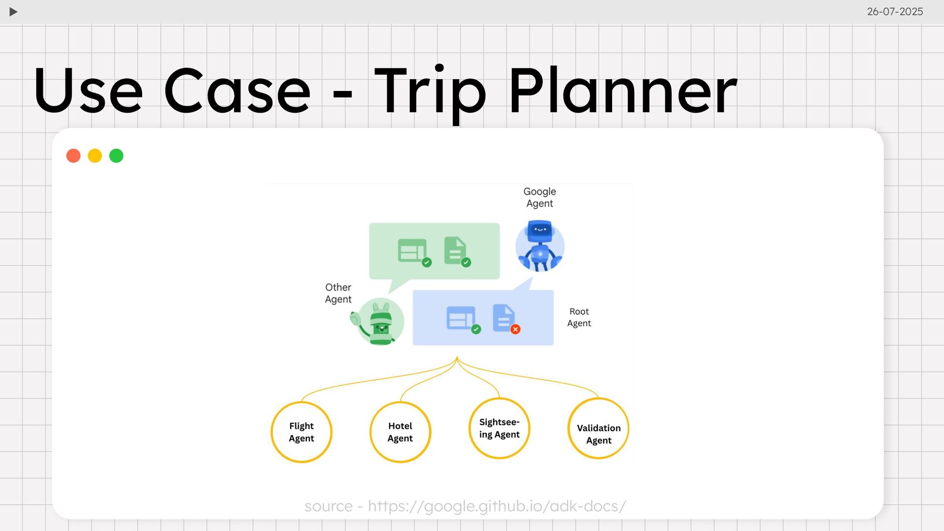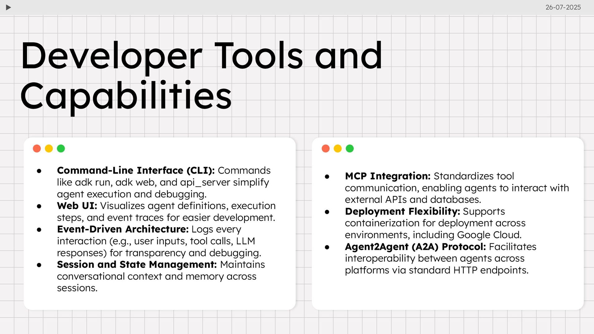 and api_server simplify agent execution and debugging. • Web UI: Visualizes agent definitions, execution steps, and event traces for easier development. • Event-Driven Architecture: Logs every interaction (e.g., user inputs, tool calls, LLM responses) for transparency and debugging. • Session and State Management: Maintains conversational context and memory across sessions. Developer Tools and Capabilities • MCP Integration: Standardizes tool communication, enabling agents to interact with external APIs and databases. • Deployment Flexibility: Supports containerization for deployment across environments, including Google Cloud. • Agent2Agent (A2A) Protocol: Facilitates interoperability between agents across platforms via standard HTTP endpoints. 26-07-2025