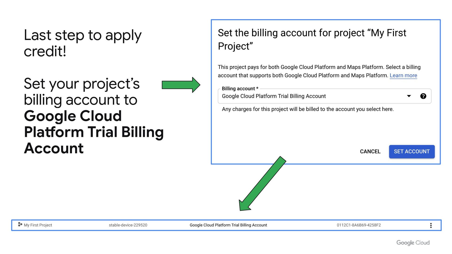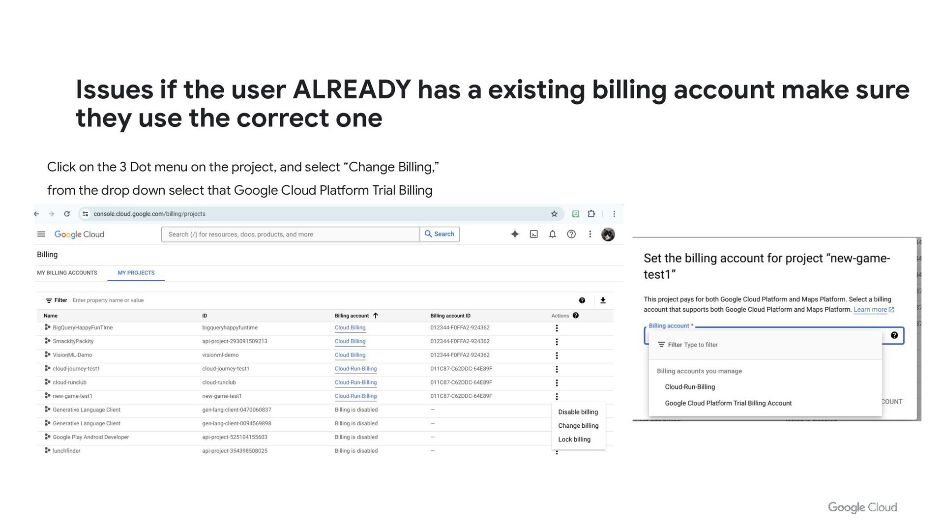 make sure they use the correct one Click on the 3 Dot menu on the project, and select “Change Billing,” from the drop down select that Google Cloud Platform Trial Billing