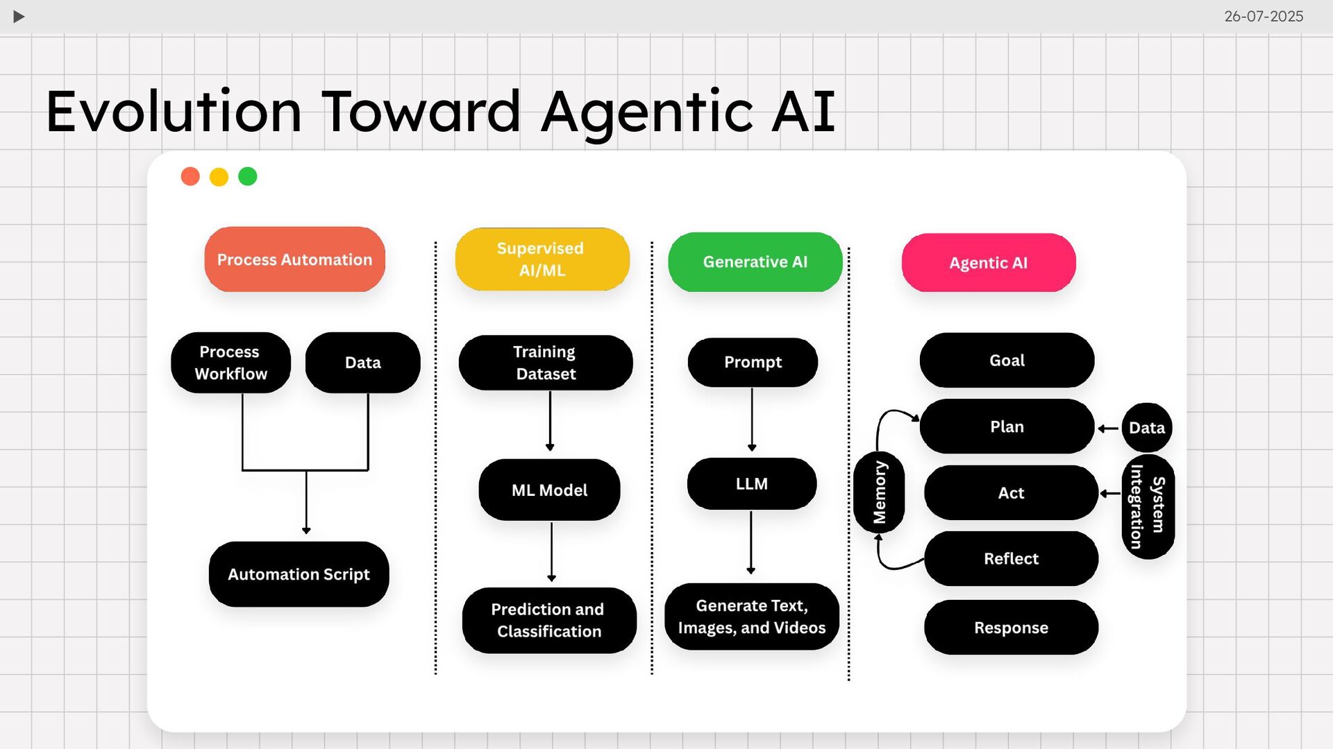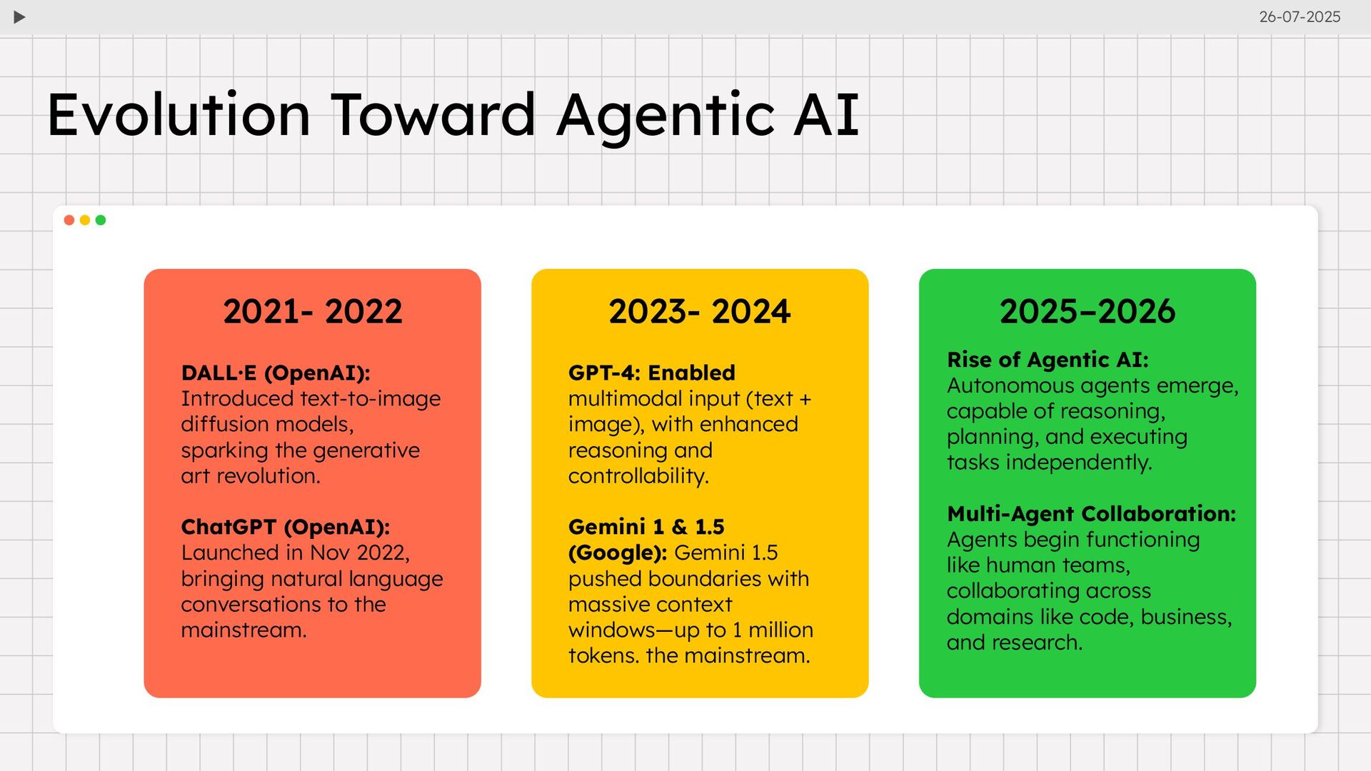 diffusion models, sparking the generative art revolution. ChatGPT (OpenAI): Launched in Nov 2022, bringing natural language conversations to the mainstream. 26-07-2025 2023- 2024 2025–2026 GPT-4: Enabled multimodal input (text + image), with enhanced reasoning and controllability. Gemini 1 & 1.5 (Google): Gemini 1.5 pushed boundaries with massive context windows—up to 1 million tokens. the mainstream. Rise of Agentic AI: Autonomous agents emerge, capable of reasoning, planning, and executing tasks independently. Multi-Agent Collaboration: Agents begin functioning like human teams, collaborating across domains like code, business, and research.