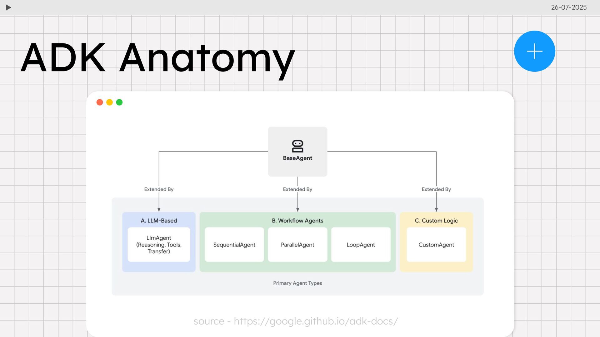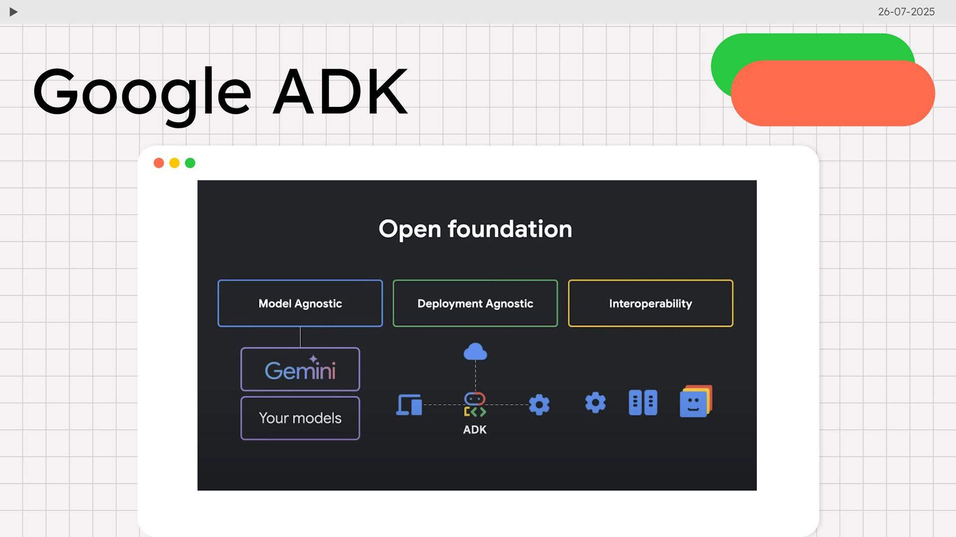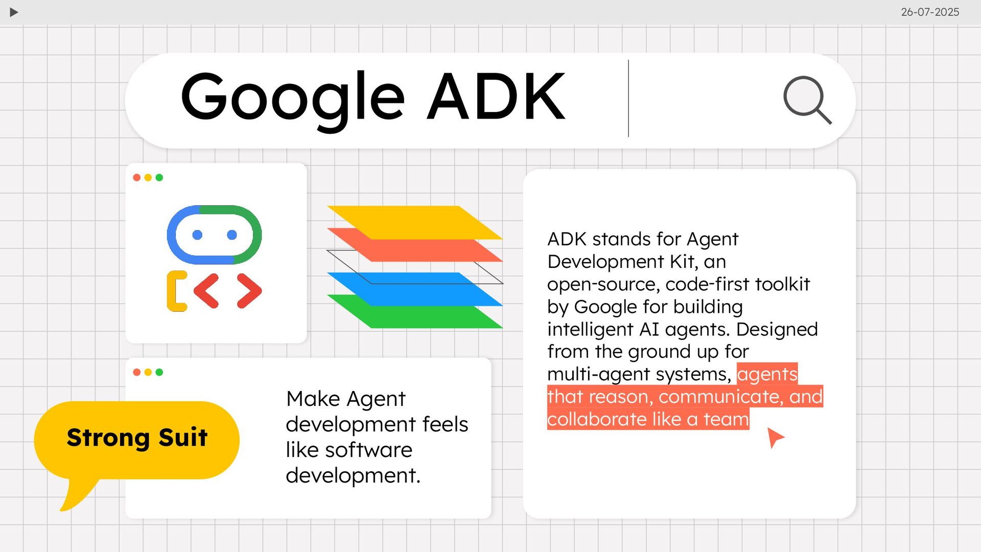 stands for Agent Development Kit, an open‑source, code‑first toolkit by Google for building intelligent AI agents. Designed from the ground up for multi-agent systems, agents that reason, communicate, and collaborate like a team Google ADK 26-07-2025