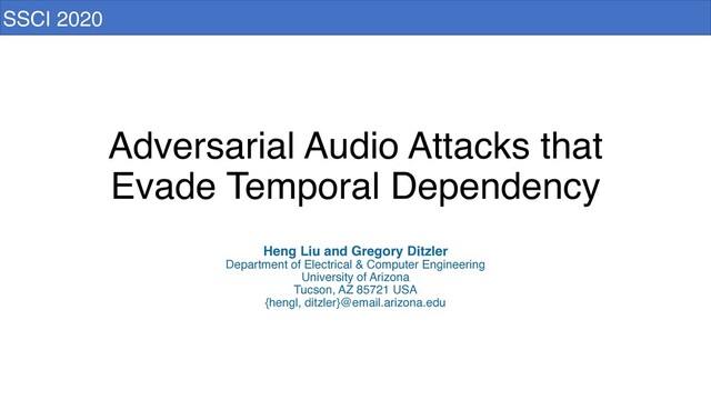 temporal dependency in adversarial audio example s • We proposed a new audio attack that evades the temporal dependency detectio n • Experiments shows the new audio attack’s efficacy and low perturbation magnitude Conclusions Future work • One future work is to incorporate temporal dependency to develop more robustness detection methods Funding • This work was supported by grants from the Department of Energy #DE-NA0003946, Army Research Lab W56KGU-20-C-0002, and National Science Foundation CAREER #1943552