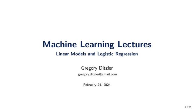 All of the models presented so far are for two class problems. We need a way to extend these classification methods to multiple classes • Mathematically, this means that the class label, yi, for each datum is now yi ∈ {1, 2, ..., c}, where c is the number of possible classifications. Split the data into c two-class problems. • For example, if we have c classes then we will have c different classifiers: class 1 against classes {2, 3, ..., c}, class 2 against classes {1, 3, ..., c}, etc. Multiclass Prediction with Logistic Regression P(Y = k|x; w1, w2, · · · , wc) = exp(wT k x) c j=1 exp(wj Tx) 41 / 44