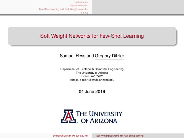 ına Motivating Few-Shot Learning Benchmarks in Few-Shot Learning Related Works Soft Weight Networks Soft Weight Networks Training Algorithm Input: Entire Training Set Tr = {(x1 , y1), ..., (xNTr , yNTr )}, number of support samples per episode N, number of query samples per episode M, number of classes per episode C, initial model φ, and model learning rate η Output: updated model φ, network loss J(φ), and class estimates yqm 1: for each episode in training data do 2: Create a set, E = {(x1 , y1), ..., (xNE , yNTE )}, of C different classes randomly chosen from Tr without replacement 3: Create disjoint sets, S = {(x1 , y1), ..., (xN , yN )} and Q = {(x1 , y1), ..., (xM , yM)}, of N support examples and M query samples from E 4: for m = 1, . . . , M do {Loop through query samples} 5: for c = 1, . . . , C do {Loop through class samples} 6: // Compute the classification scores for every query sample 7: αqm(c) = (xsi,ysi)∈Sc bφ(fφ(xsi)) + fT φ (xqm)wφ(fφ(xsi)) 8: βqm(c) = (xsi,ysi)∈Sc bφ(fφ(xqm)) + fT φ (xsi)wφ(fφ(xqm)) 9: end for 10: for c = 1, . . . , C do 11: pφ(y = c|xqm) = e(αqm(c)+βqm(c)) c ∈C e(αqm(c )+βqm(c )) {Estimate posterior via softmax} 12: end for 13: yqm =c∈C [pφ(y = c|xqm )] {Estimate class of query sample} 14: end for 15: J(φ) = − 1 CM C c =1 M q=1 log(pφ(y = c |xqm)) {Compute average loss of episode} 16: φ ← φ − η∇φJ(φ) {Update model} 17: end for Drexel University (04 June 2019) Soft Weight Networks for Few-Shot Learning