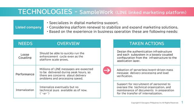 Java/Springboot(BE) LINE distribution : Utilizes fully managed services • Lambda, S3, SQS, DynamoDB, CloudWatch Events. Security design•configuration • CloudFront, WAF, AWS Shield, GuardDuty, Amazon Inspector, Security Group, etc. • Follows IPA「How to Secure Your Web Site ver.7」 • External security diagnostic tool「ScoutSuite」 Copyright © Gecogeco Philippines Inc All Rights Reserved. TECHNOLOGIES - SampleWork (LINE linked marketing platform) 2