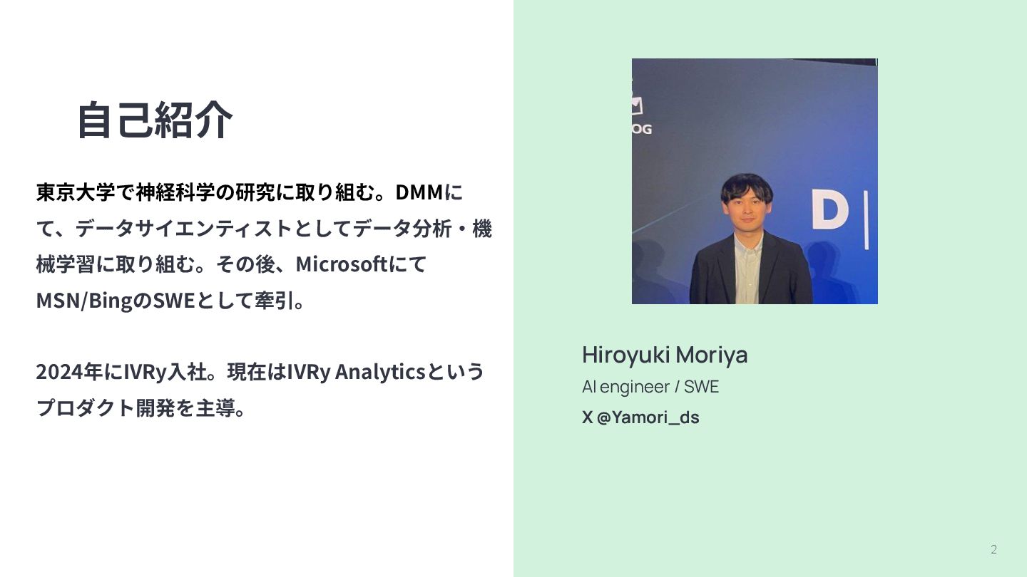 2 東京⼤学で神経科学の研究に取り組む。DMMに て、データサイエンティストとしてデータ分析‧機 械学習に取り組む。その後、Microsoftにて MSN/BingのSWEとして牽引。 2024年にIVRy⼊社。現在はIVRy Analyticsという プロダクト開発を主導。 Hiroyuki Moriya