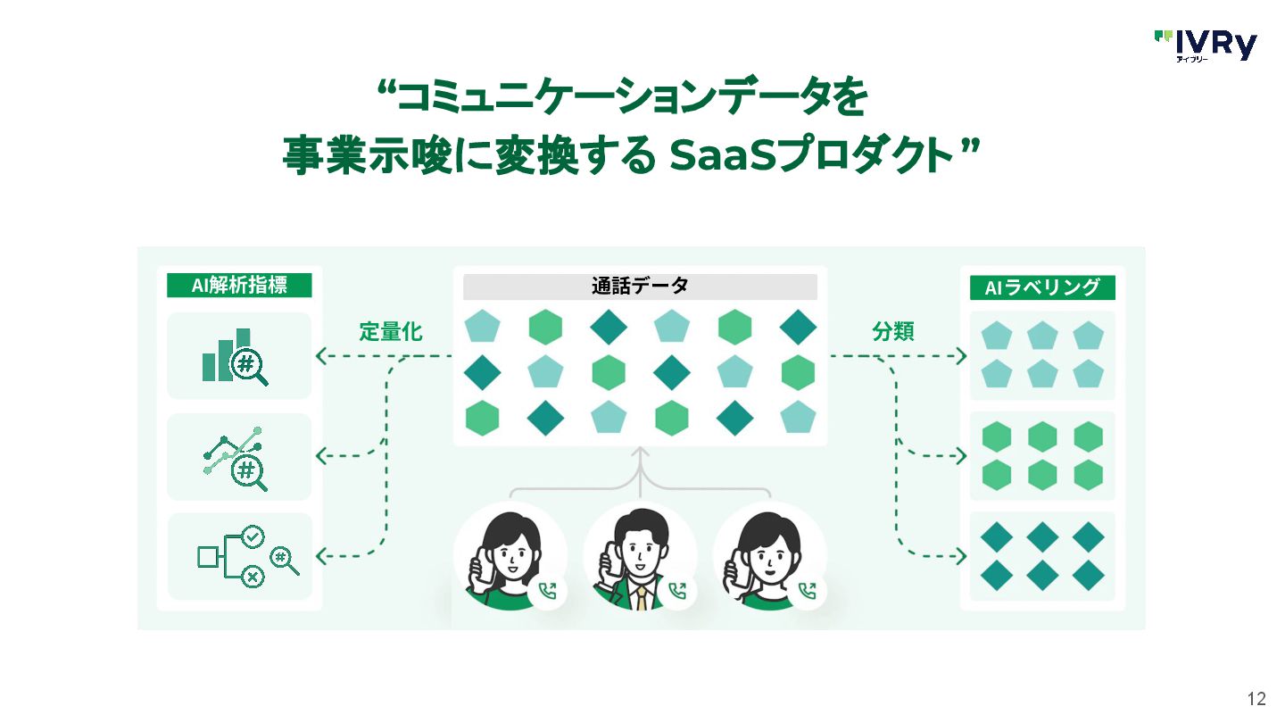 12 AIラベリング 通話データ AI解析指標 “コミュニケーションデータを 事業示唆に変換する SaaSプロダクト ” 定量化 分類