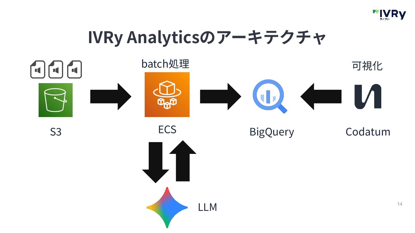 IVRy Analyticsのアーキテクチャ 14 S3 ECS BigQuery Codatum LLM batch処理 可視化