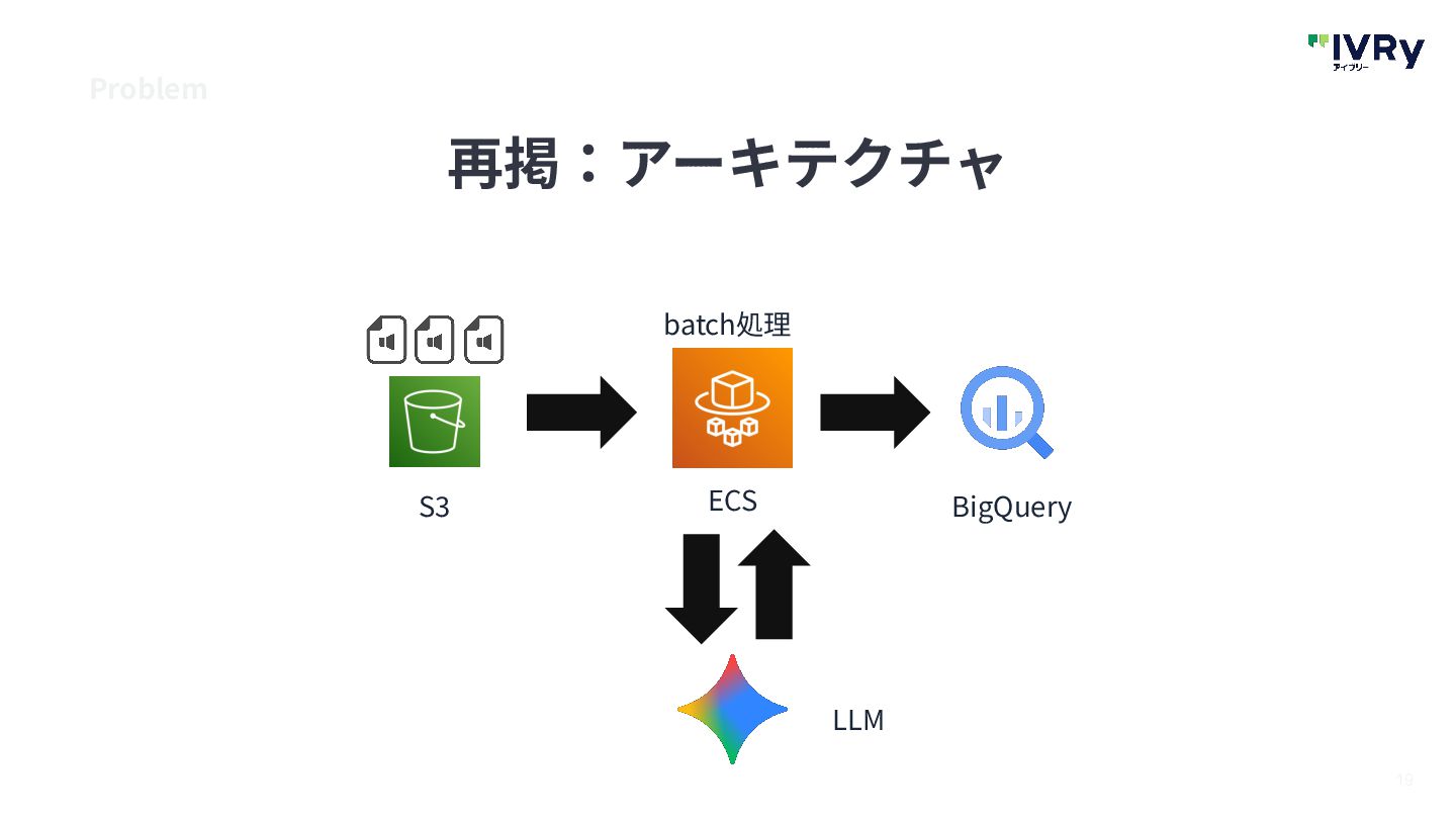 19 再掲:アーキテクチャ Problem S3 ECS BigQuery LLM batch処理