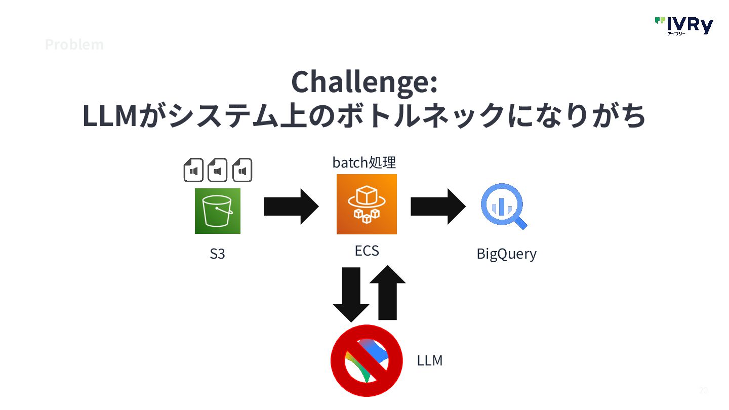 20 Challenge: LLMがシステム上のボトルネックになりがち Problem S3 ECS BigQuery LLM batch処理