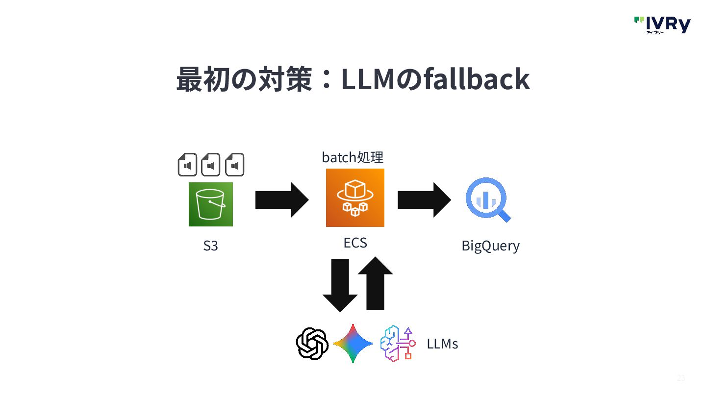 23 最初の対策:LLMのfallback S3 ECS BigQuery LLMs batch処理