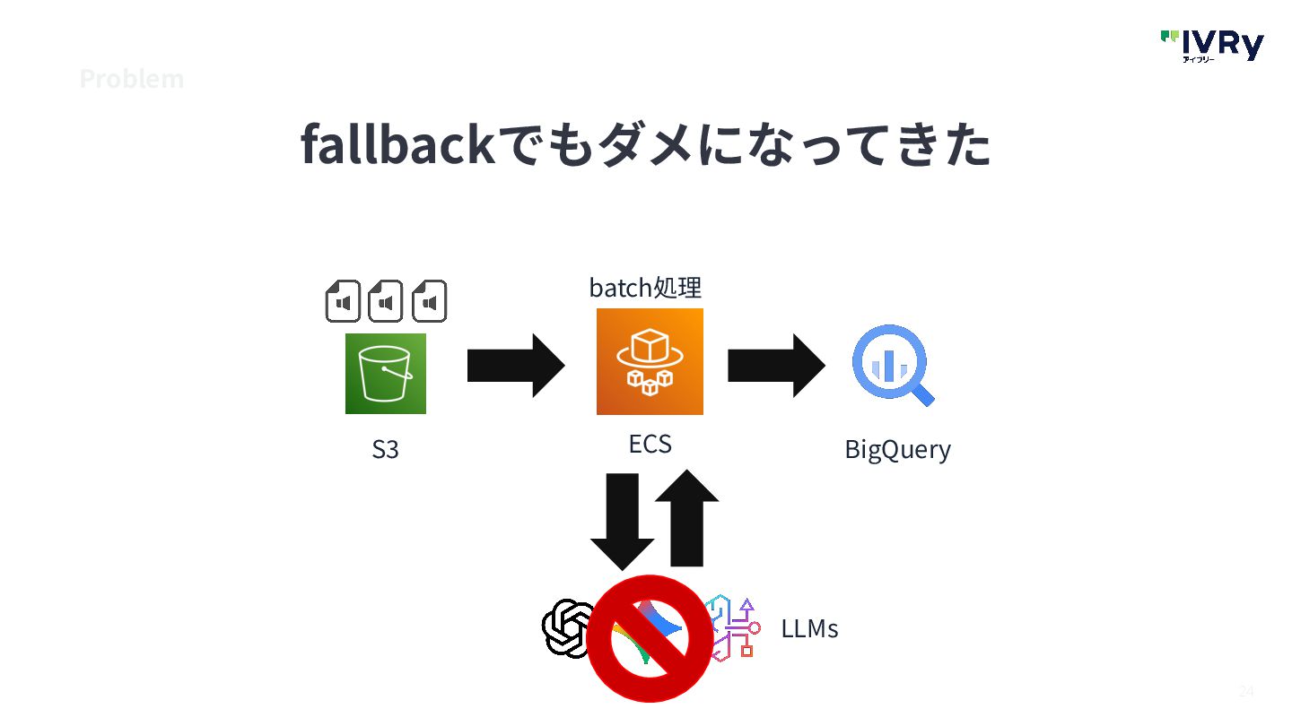 24 fallbackでもダメになってきた Problem S3 ECS BigQuery LLMs batch処理