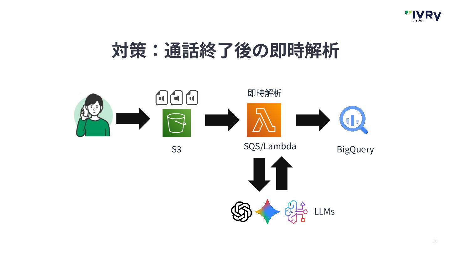 26 対策:通話終了後の即時解析 S3 SQS/Lambda BigQuery LLMs 即時解析