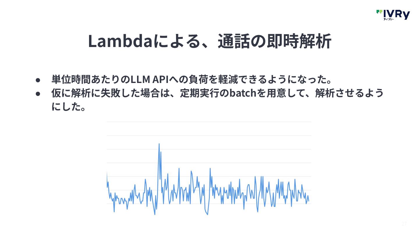 27 • 単位時間あたりのLLM APIへの負荷を軽減できるようになった。 • 仮に解析に失敗した場合は、定期実⾏のbatchを⽤意して、解析させるよう にした。 Lambdaによる、通話の即時解析