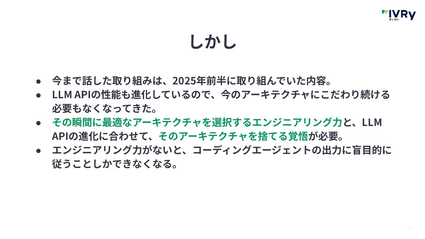 28 • 今まで話した取り組みは、2025年前半に取り組んでいた内容。 • LLM APIの性能も進化しているので、今のアーキテクチャにこだわり続ける 必要もなくなってきた。 • その瞬間に最適なアーキテクチャを選択するエンジニアリング⼒と、LLM APIの進化に合わせて、そのアーキテクチャを捨てる覚悟が必要。