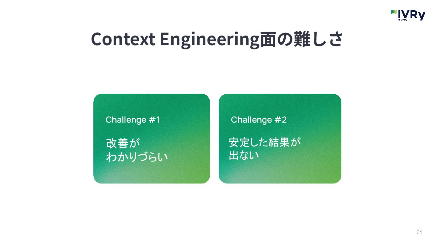 改善が わかりづらい Challenge #1 安定した結果が 出ない Challenge #2 Context Engineering⾯の難しさ