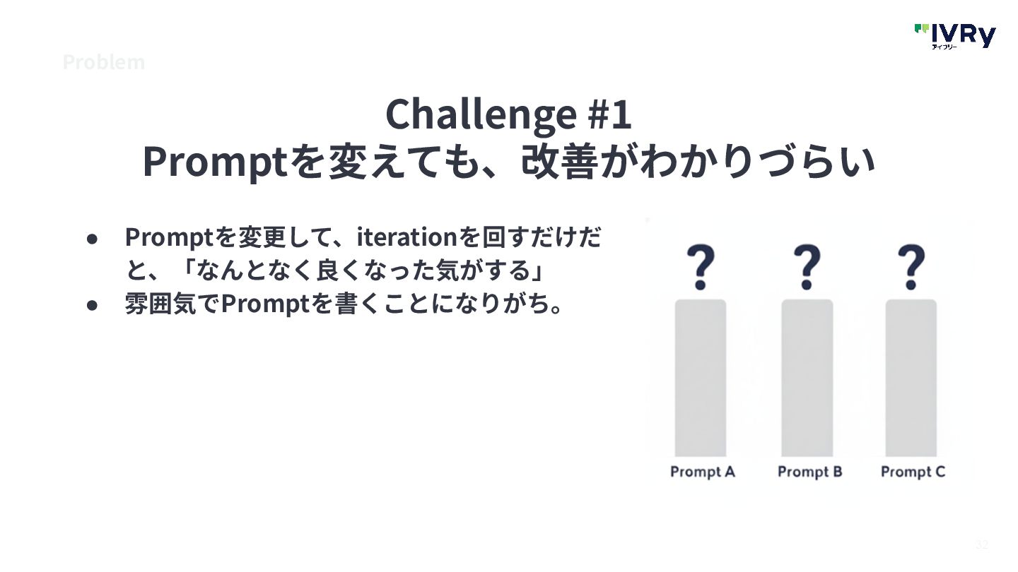 32 Challenge #1 Promptを変えても、改善がわかりづらい Problem • Promptを変更して、iterationを回すだけだ と、「なんとなく良くなった気がする」 • 雰囲気でPromptを書くことになりがち。