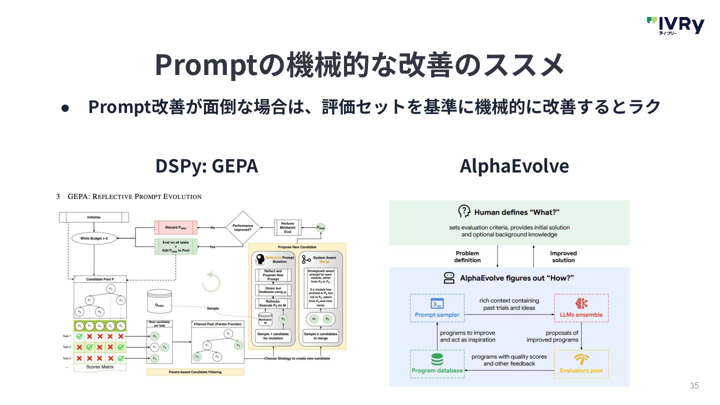 Promptの機械的な改善のススメ 35 DSPy: GEPA AlphaEvolve • Prompt改善が⾯倒な場合は、評価セットを基準に機械的に改善するとラク