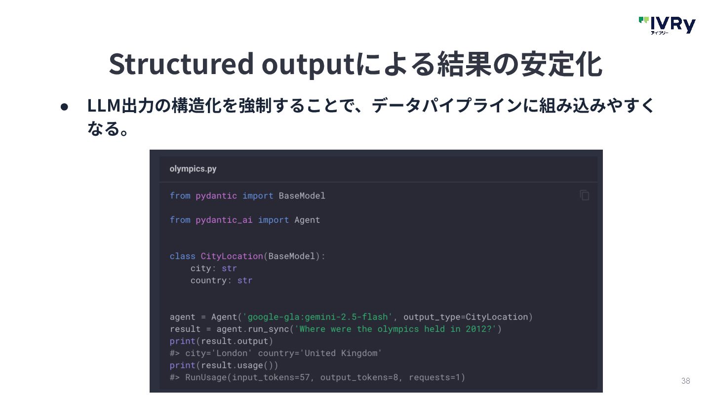 Structured outputによる結果の安定化 38 • LLM出⼒の構造化を強制することで、データパイプラインに組み込みやすく なる。