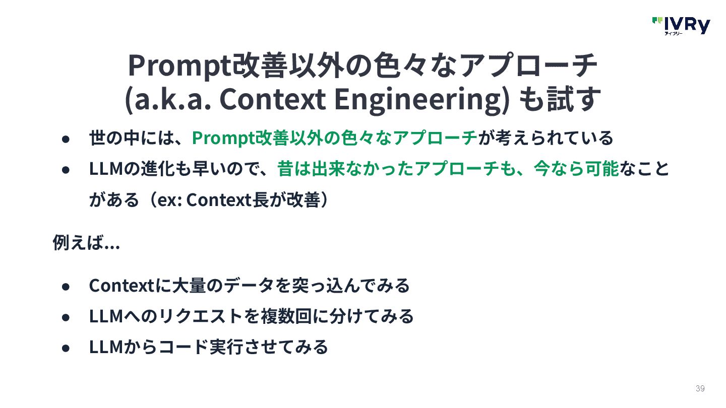 Prompt改善以外の⾊々なアプローチ (a.k.a. Context Engineering) も試す 39 • 世の中には、Prompt改善以外の⾊々なアプローチが考えられている • LLMの進化も早いので、昔は出来なかったアプローチも、今なら可能なこと