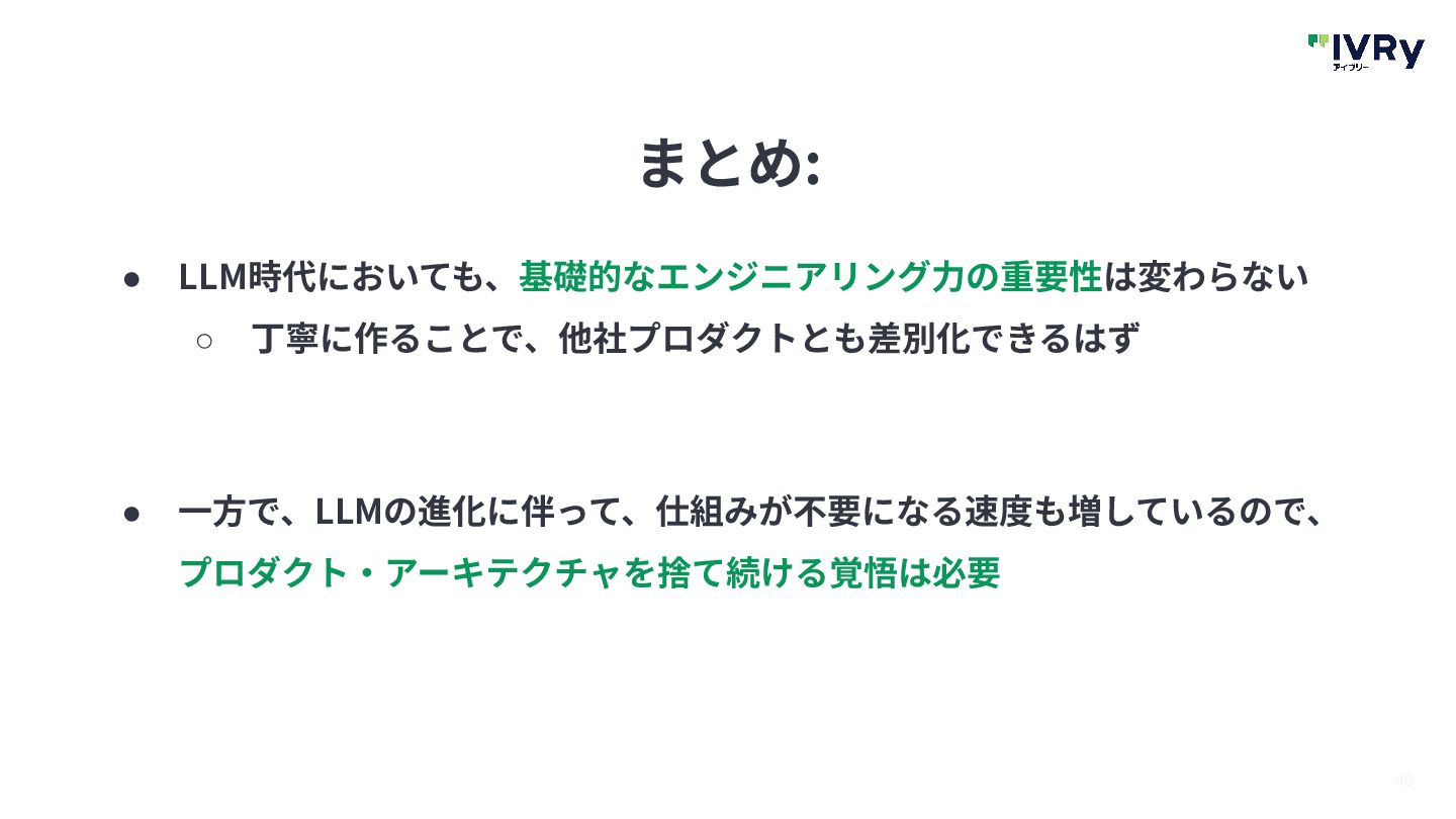 40 まとめ: • LLM時代においても、基礎的なエンジニアリング⼒の重要性は変わらない ◦ 丁寧に作ることで、他社プロダクトとも差別化できるはず • ⼀⽅で、LLMの進化に伴って、仕組みが不要になる速度も増しているので、 プロダクト‧アーキテクチャを捨て続ける覚悟は必要
